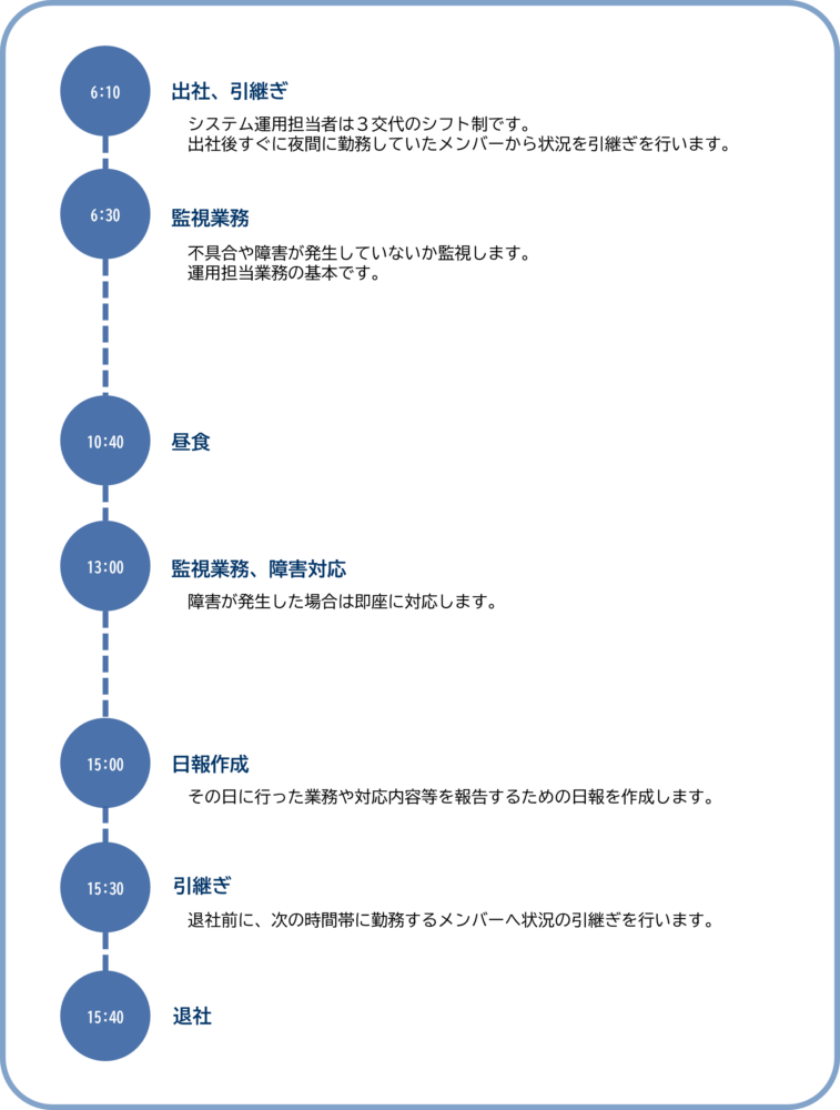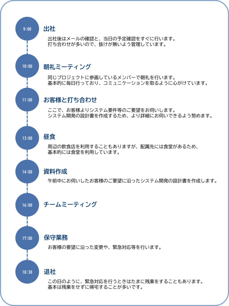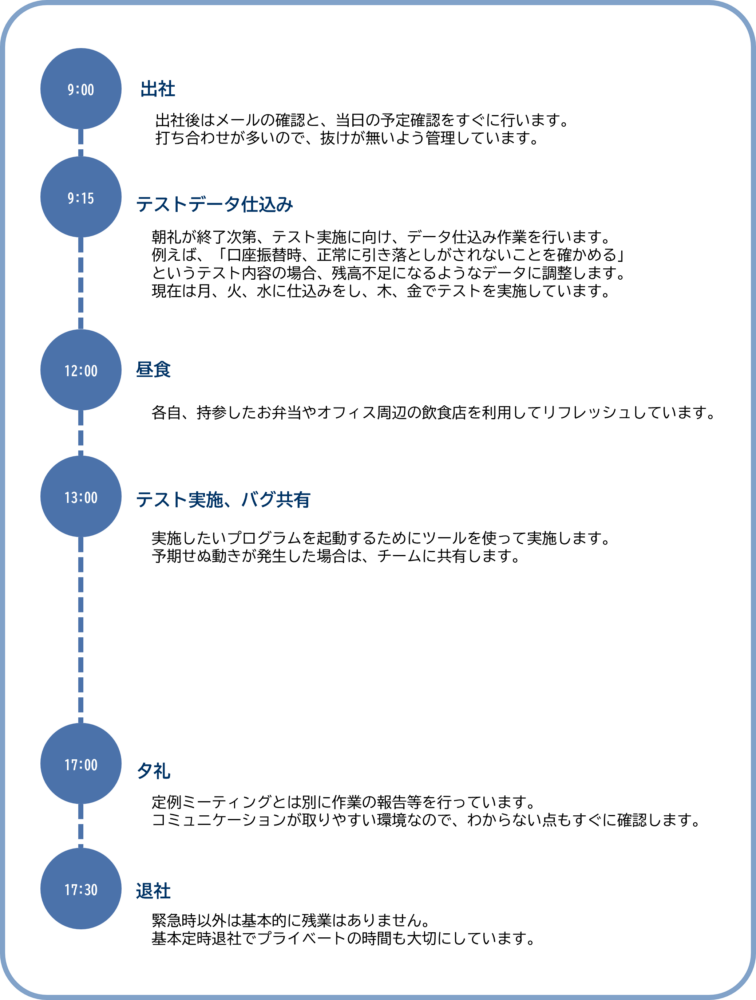 One day 社員の1日 (一般) 金融システム事業部所属 プログラマーの1日 開発途中のシステムにおいて、テスト作業を実施している社員の1日を紹介します。 (係長) 金融システム事業部所属 システムエンジニアの1日 チームリーダーを任されてるシステムエンジニアの1日を紹介します。 (主任) 金融システム事業部所属 システム運用担当の1日 システム運用担当者の1日を紹介します。 各職種の業務内容はこちら